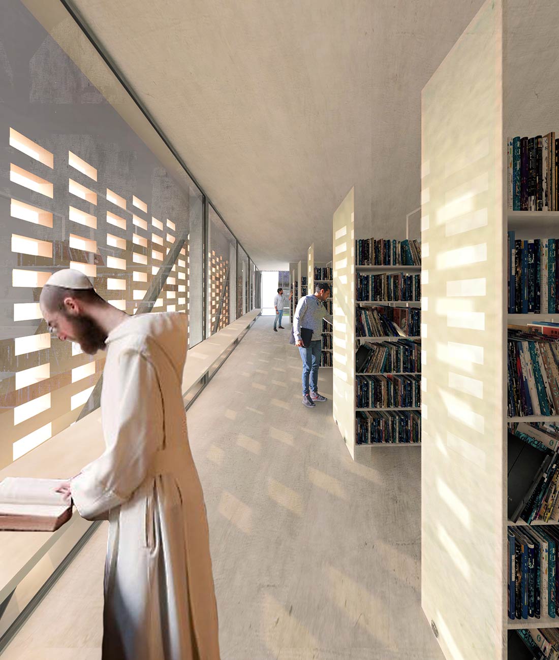 The extension of the monastery library adopts the reduced typology characteristic of Cistercian architecture, referencing the spatial logic and tectonic order of the ideal monastic plan. Rather than aiming for formal assimilation, the transition between existing and new elements is conceived as a morphological dialogue that maintains difference as a legible quality.